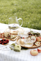 Бамбуковые тарелки и доски для подачи фруктов, выпечки и закусок — отличный вариант для подобного выезда. Также захватите несколько стаканов из хрустального стекла для напитков и фарфоровую ёмкость для меда или джема.