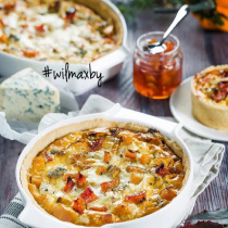 - Выложить на основу кубики тыквы, покрошенный голубой сыр и пастилу из айвы, предварительно нарезанную на кубики. Залить слегка взбитыми сливками с яйцами, солью и перцем, запекать в течение 20 минут, пока сливки не застынут и поверхность не станет светло-золотистой.