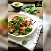 - Выкладываем салат на тарелку. Сначала листья шпината, затем орешки авокадо и бекон. Добавляем заправку и все перемешиваем!