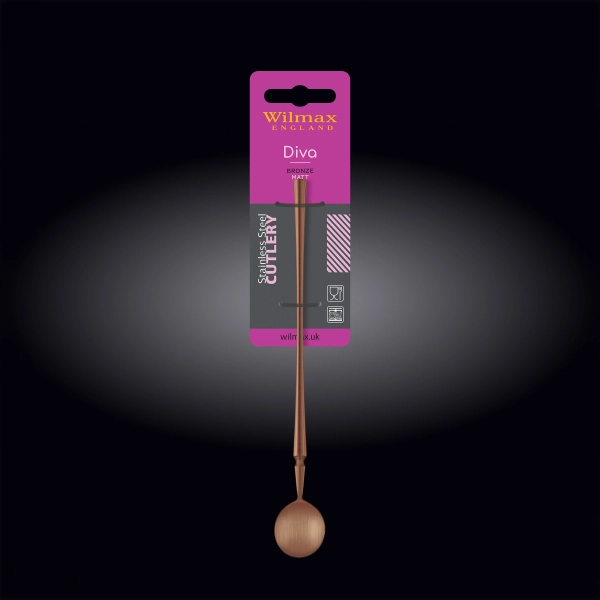 Утонченная коктейльная ложка из коллекции Diva Wilmax изготовлен из высококачественной нержавеющей стали марки 18/10 цвета бронзы. Коктейльные ложки, как и все стальные изделия WILMAX прочны и устойчивы к коррозии, деформации и притуплению, а также к образованию пятен на их поверхности, вызванных воздействием щелочей и кислот. Они абсолютно безопасны и не изменяют вкусовые качества, запах и цвет пищи, так как не вступают в реакцию с ее компонентами. Легко моются, сохраняя при этом яркий, привлекательный внешний вид, а также подходят для посудомоечных машин.