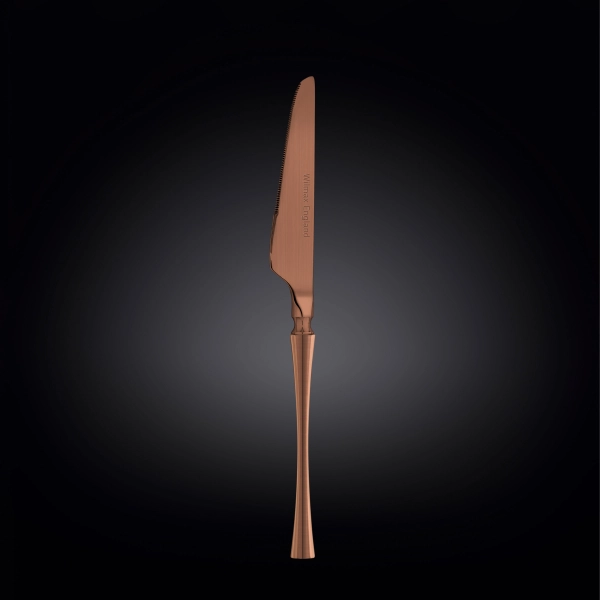 Утонченный столовый нож из коллекции Diva Wilmax изготовлен из высококачественной нержавеющей стали марки 18/10 цвета бронзы. Столовые ножи, как и все стальные изделия WILMAX прочны и устойчивы к коррозии, деформации и притуплению, а также к образованию пятен на их поверхности, вызванных воздействием щелочей и кислот. Они абсолютно безопасны и не изменяют вкусовые качества, запах и цвет пищи, так как не вступают в реакцию с ее компонентами. Легко моются, сохраняя при этом яркий, привлекательный внешний вид, а также подходят для посудомоечных машин.